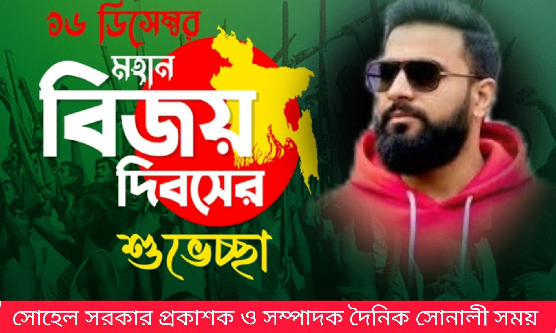 বিজয় দিবসের এই প্রত্যয়দীপ্ত লগ্নে, দৈনিক সোনালী সময় অঙ্গীকারবদ্ধ—মুক্তিযুদ্ধের চেতনাকে সমুন্নত রেখে বস্তুনিষ্ঠ ও দায়িত্বশীল সাংবাদিকতার মাধ্যমে দেশ ও জাতির কল্যাণে কাজ করে যেতে। আসুন, আমরা সকলে মিলে ক্ষুধা ও দারিদ্র্যমুক্ত, অসাম্প্রদায়িক এবং সমৃদ্ধ ‘সোনার বাংলা’ বিনির্মাণে ঐক্যবদ্ধ হই।