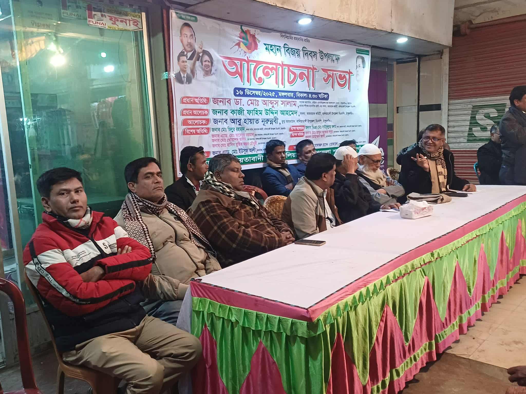 ১৬ ই ডিসেম্বর মহান বিজয় দিবস উপলক্ষে ঠাকুরগাঁওয়ের বালিয়াডাঙ্গী উপজেলা বিএনপির আহব্বায়ক কমিটি উদ্যোগে মঙ্গলবার বিকাল ৫টায় স্থানীয় টি হোসেন মার্কেটের সামনে আলোচনা সভা অনুষ্ঠিত হয়।