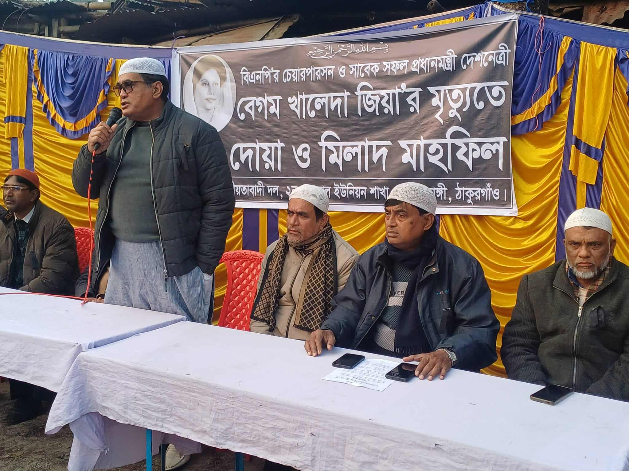 সাবেক তিন বারের প্রধানমন্ত্রী ও বিএনপি চেয়ারপার্সন মরহুমা বেগম খালেদা জিয়ার রুহের মাগফেরাত কামনায় বালিয়াডাঙ্গী উপজেলার চাড়োল ইউনিয়ন বিএনপির আয়োজনে শনিবার (৩ জানুয়ারী) বিকাল ৪ টায় চাড়োল ইউনিয়ন বিএনপির লাহিড়ী হাটের অস্থায়ী কার্যালয়ের সামনে দোয়া ও মিলাদ মাহফিলের আয়োজন করা হয়। দোয়া মাহফিলের শুরুর আগে সংক্ষিপ্ত আলোচনায় প্রধান অতিথি হিসেবে বক্তব্য রাখেন-ঠাকুরগাঁও জেলা বিএনপির সাবেক সাংগঠনিক সম্পাদক ও চাড়োল ইউনিয়ন পরিষদের সাবেক সফল ইউপি চেয়ারম্যান জননেতা আবু হায়াত নুরুন্নবী।