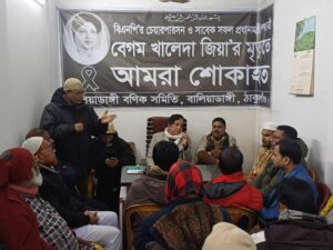 সাবেক তিন বারের প্রধানমন্ত্রী ও বিএনপির চেয়ারপার্সন মরহুমা বেগম খালেদা জিয়ার রুহের মাগফেরাত কামনায় বালিয়াডাঙ্গী বণিক সমিতির উদ্যোগে ২ রা জানুয়ারী(শুক্রবার) সন্ধ্যায় বালিয়াডাঙ্গী টি হোসেন মার্কেটের সামনে দোয়া ও মিলাদ মাহফিলের আয়োজন করে।