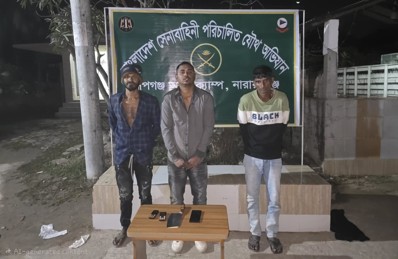 সুনির্দিষ্ট গোয়েন্দা তথ্যের ভিত্তিতে নারায়ণগঞ্জের রূপগঞ্জে সেনাবাহিনীর তত্ত্বাবধানে এক বিশেষ যৌথ অভিযান পরিচালনা করে ডাকাতি, অপহরণ ও মাদকসহ বিভিন্ন অপরাধে জড়িত একটি সংঘবদ্ধ চক্রের তিন সদস্যকে গ্রেফতার করা হয়েছে। রোববার রাতে রূপগঞ্জ আর্মি ক্যাম্পের নেতৃত্বে উপজেলার গোলাকান্দাইল এলাকায় পরিচালিত এই অভিযানে চক্রের মূল হোতা রাসেল ফকির (৩০) এবং তার দুই সহযোগী বাদল ফকির (২৭) ও মনজুরুল (২৯)-কে আটক করা হয়।