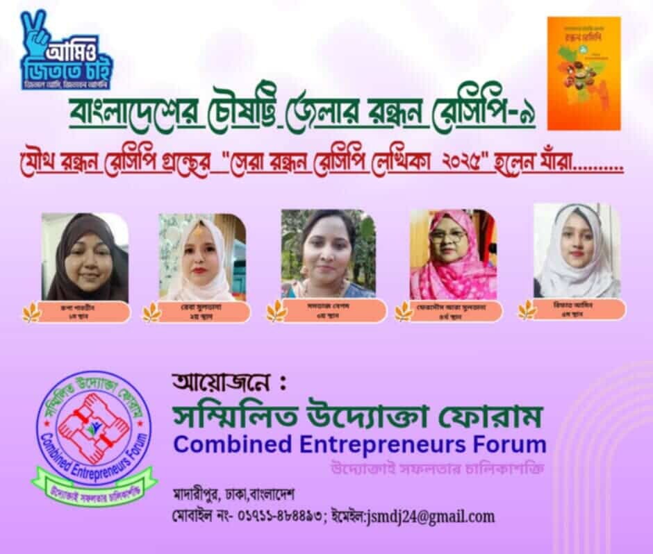 সম্মিলিত উদ্যোক্তা ফোরাম কর্তৃক আয়োজিত এবং এস এম দেলোয়ার জাহান সম্পাদিত "বাংলাদেশের চৌষট্টি জেলার রন্ধন রেসিপি -৯" যৌথ রন্ধন রেসিপি গ্রন্থে যেসকল রন্ধনশিল্পী (নারী উদ্যোক্তা) রন্ধন রেসিপি লেখা জমা দিয়েছেন, তাদের রন্ধন রেসিপি লেখা জমার উপর ভিত্তি করে গতকাল ২৮ অক্টোবর ২০২৫ খ্রি. রোজ মঙ্গলবার বিকাল ০৫:০০ ঘটিকায় ফোরামের কেন্দ্রীয় কার্যালয়ে অনুষ্ঠিত "সেরা রন্ধন রেসিপি লেখিকা ২০২৫" নির্বাচন করার সিদ্ধান্ত গৃহীত হয়। যারা "সেরা রন্ধন রেসিপি লেখিকা ২০২৫" নির্বাচিত হয়েছেন তাদের তালিকা নিম্নরুপ: