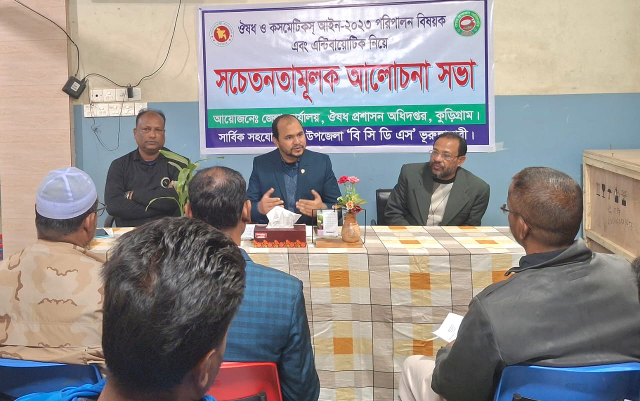 কুড়িগ্রামের ভুরুঙ্গামারীতে ঔষধ ও কসমেটিক্স আইন-২০২৩ পরিপালন বিষয়ক সচেতনতামূলক সভা অনুষ্ঠিত হয়েছে