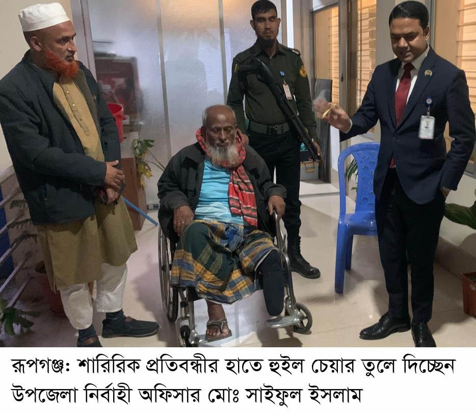 বিশ্ব প্রতিবন্ধী দিবস উপলক্ষে নারায়ণগঞ্জের রূপগঞ্জ উপজেলার মুড়াপাড়া ইউনিয়নের মাছিমপুর গ্রামের হতদরিদ্র শারিরিক প্রতিবন্ধী নাছির উদ্দিন ভুঁইয়াকে(৬৮) হুইল চেয়ার উপহার দেওয়া হয়েছে। গত ১৫জানুয়ারি বৃহস্পতিবার বিকেলে নাছির উদ্দিন ভুঁইয়ার হাতে রূপগঞ্জ উপজেলা নির্বাহী অফিসার মোঃ সাইফুল ইসলাম তার ব্যাক্তিগত তহবিল থেকে তিনি এ উপহার তুলে দেন।