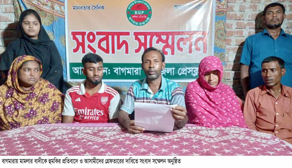 বাগমারায় হামলা চালিয়ে বাড়িঘর ভাংচুর ও লুটপাটের অভিযোগে মামলা করায় বাদী ও তার পরিবারের সদস্যদের হুমকি দেওয়া হচ্ছে বলে অভিযোগ উঠেছে। বুধবার (২৯ অক্টোবর ) বিকেলে বাগমারা উপজেলা প্রেসক্লাবে সংবাদ সম্মেলন করে এই অভিযোগ করেছেন মামলার বাদী শুভডাঙ্গা ইউনিয়নের বারুইপাড়া গ্রামের মৃত সদের আলীর ছেলে ছেনামুল হক। এ সময় ছেনামুল হকের স্ত্রী শাবানা বেগম, মা জাহানার বেগম, মেয়ে রেশমী খাতুন, ছোট ভাই এনামুল হক ও মাহাবুর রহমানসহ পরিবারের অন্যান্য সদস্যরাও উপস্থিত ছিলেন।