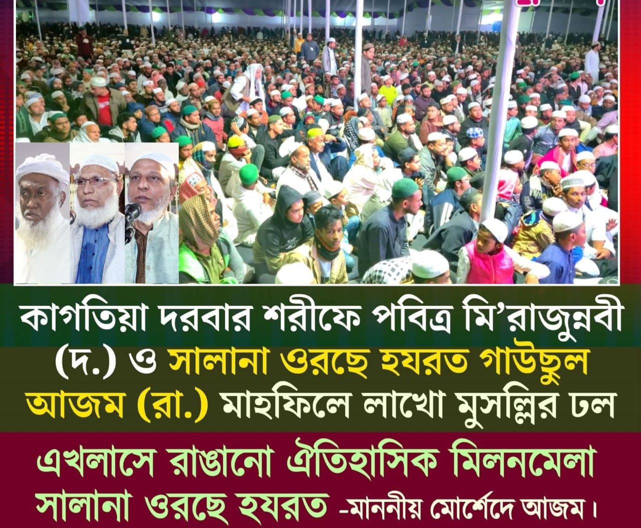 ১৬ জানুয়ারি (শুক্রবার) দিন-রাতব্যাপী চট্টগ্রাম কাগতিয়া আলীয়া গাউছুল আজম দরবার শরীফে অনুষ্ঠিত কাগতিয়া দরবারের প্রতিষ্ঠাতা খলিলুল্লাহ, আওলাদে মোস্তফা, খলিফায়ে রাসূল (দ.), হযরত শায়খ ছৈয়্যদ গাউছুল আজম রাদ্বিয়াল্লাহু আনহুর স্মরণে ৭৩ তম পবিত্র মি’রাজুন্নবী (দ.) উদযাপন ও সালানা ওরছে হযরত গাউছুল আজম রাদ্বিয়াল্লাহু আনহুর ঈছালে ছাওয়াব মাহফিলে এ মহামনীষীর একমাত্র খলিফা, হযরতুলহাজ্ব আল্লামা অধ্যক্ষ শায়খ ছৈয়্যদ মাননীয় মোর্শেদে আজম মাদ্দাজিল্লুহুল আলী প্রধান অতিথির বক্তব্যে এসব কথা বলেন।