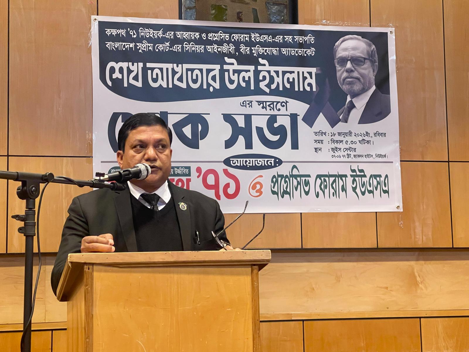 গক রবিবার,১৮ জানুয়ারী ২০২৬নিউইয়র্কের জ্যাকসন হাইটসে এর জুইস সেন্টারে সন্ধ্যা ৭টায় কক্ষপথ”৭১ নিউইয়ক ও প্রগ্রেসিভ ফোরাম ইউএসএ এর উদ্যোগে বীর মুক্তিযোদ্ধা অ্যাডভোকেট শেখ আকতার উল ইসলাম এর স্মরণে শোক সভা অনুষ্ঠিত হয়। উক্ত শোক সভায় সভাপতিত্ব করেন প্রগ্রেসিভ ফোরামের সাবেক সভাপতি বীর মুক্তিযোব্ধা খোরশেদ উল ইসলাম ও সঞ্চালনা করেন কক্ষপথ”৭১ নিউইয়কের যুগ্ম আহ্বায়ক অ্যাডভোকেট মিয়া এইচ জাকির।