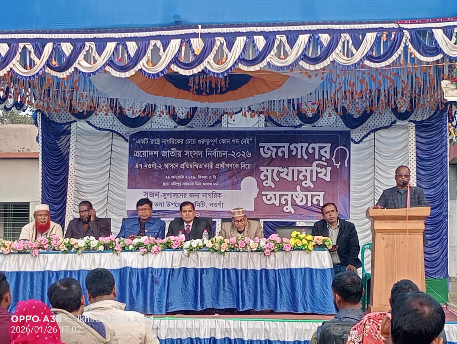২৬ জানুয়ারি ২০২৬ সোমবার বেলা ৩টায় নওগাঁর পত্নীতলায় ত্রয়োদশ জাতীয় সংসদ নির্বাচন ও গণভোট ২০২৬ এ ৪৭ নওগাঁ ২ আসনে প্রতিদ্বন্দ্বী প্রার্থীদের নিয়ে জনগনের মুখোমুখি অনুষ্ঠান অনুষ্ঠিত হয়েছে। সুজন-সুশাসনের জন্য নাগরিক পত্নীতলা উপজেলা কমিটির আয়োজনে নজিপুর সরকারি কলেজ মাঠে জনগণের মুখোমুখি অনুষ্ঠিত হয়েছে। সুজনের পত্নীতলা উপজেলা কমিটির সভাপতি ও পত্নীতলা প্রেসক্লাব সভাপতি আলহাজ্ব বুলবুল চৌধুরী অনুষ্ঠানে সভাপতিত্ব করেন। এ সময় বাংলাদেশ জাতীয়তাবাদী দল মনোনীত মোহাম্মদ শামসুজ্জোহা খান ও আমার বাংলাদেশ পার্টি মনোনীত মোঃ মতিবুল ইসলাম উপস্থিত ছিলেন। অনুষ্ঠানে প্রার্থীরা নিজ নিজ দল এবং এলাকার জন্য তাদের নির্বাচনী ইশতেহার ঘোষণা করেন। জনসাধারণ এলাকার উন্নয়নের স্বার্থে প্রার্থীদের বিভিন্ন প্রশ্ন করেন। জনগণের মুখোমুখি অনুষ্ঠানে অতিথি হিসেবে উপস্থিত ছিলেন নওগাঁ জেলা সুজন কমিটির সভাপতি মোঃ মোফাজ্জল হোসেন, সাধারণ সম্পাদক মোকসেদ আলী, পত্নীতলা পিস ফ্যাসিলিটেটর গ্রুপের তোমার নয়কারী সাজেদুর রহমান দুলাল, জয়নাল আবেদীন, সুজনের সমন্বয়কারী মিজানুর রহমান ও আসির উদ্দিন প্রমুখ। অনুষ্ঠানে প্রার্থীদের ভোটাধিকার প্রদান, সুষ্ঠু, শান্তিপূর্ণ নির্বাচন অনুষ্ঠান, সংস্কারের স্বপক্ষে গণভোট প্রদান বিশেষ গুরুত্ব পায়।