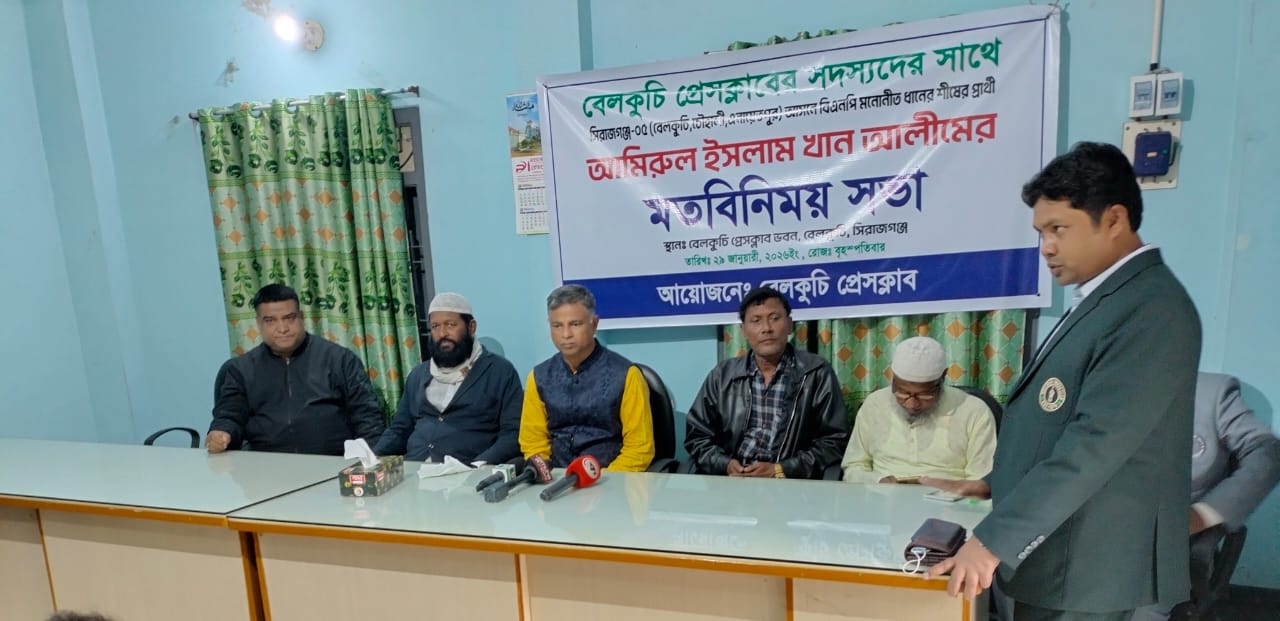 সিরাজগঞ্জ ৫ আসন( বেলকুচি ও চৌহালী উপজেলা) বিএনপি প্রার্থী আমিরুল ইসলাম খান আলিম, বেলকুচি প্রেসক্লাবের সাংবাদিকদের সাথে মতবিনিময় করেন। গত ২৯ জানুয়ারি ২০২৬ দুপুর ১২টায় প্রেসক্লাবে এ মতবিনিময় অনুষ্ঠানের আয়োজন করে সাংবাদিকেরা।