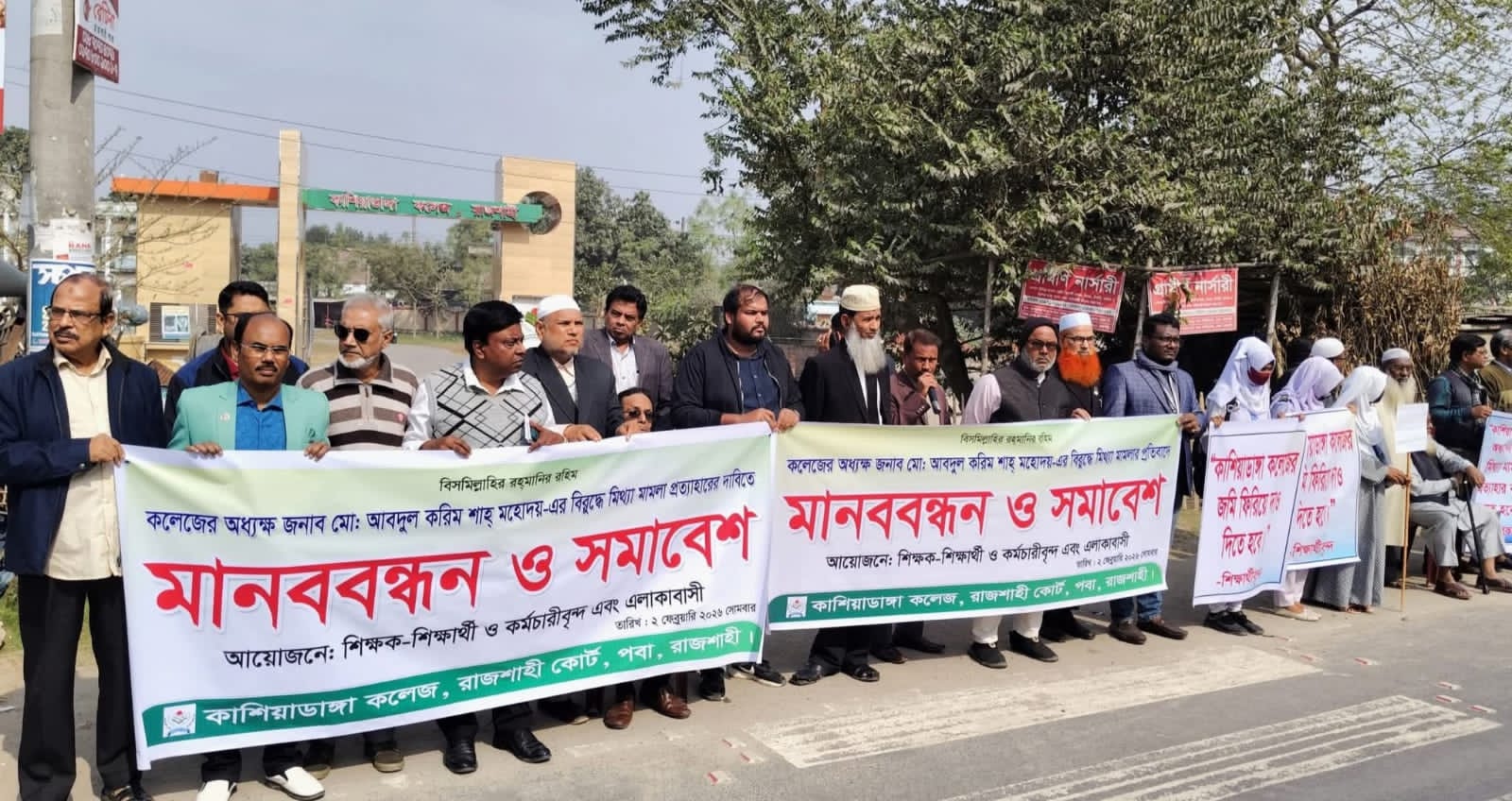 রাজশাহীর পবা উপজেলার কাশিয়াডাঙা কলেজের অধ্যক্ষ আবদুল শাহের বিরুদ্ধে মামলার প্রতিবাদে মানববন্ধন ও সমাবেশ হয়েছে। সোমবার বেলা ১১টায় কলেজের ফটকের সামনে রাজশাহী-চাঁপাইনবাবগঞ্জ মহাসড়কের পাশে এই কর্মসূচি পালিত হয়। এতে সভাপতিত্ব করেন পৌরনীতি ও সুশাসন বিষয়ের সহকারী অধ্যাপক বেগম নারগীস আরা।