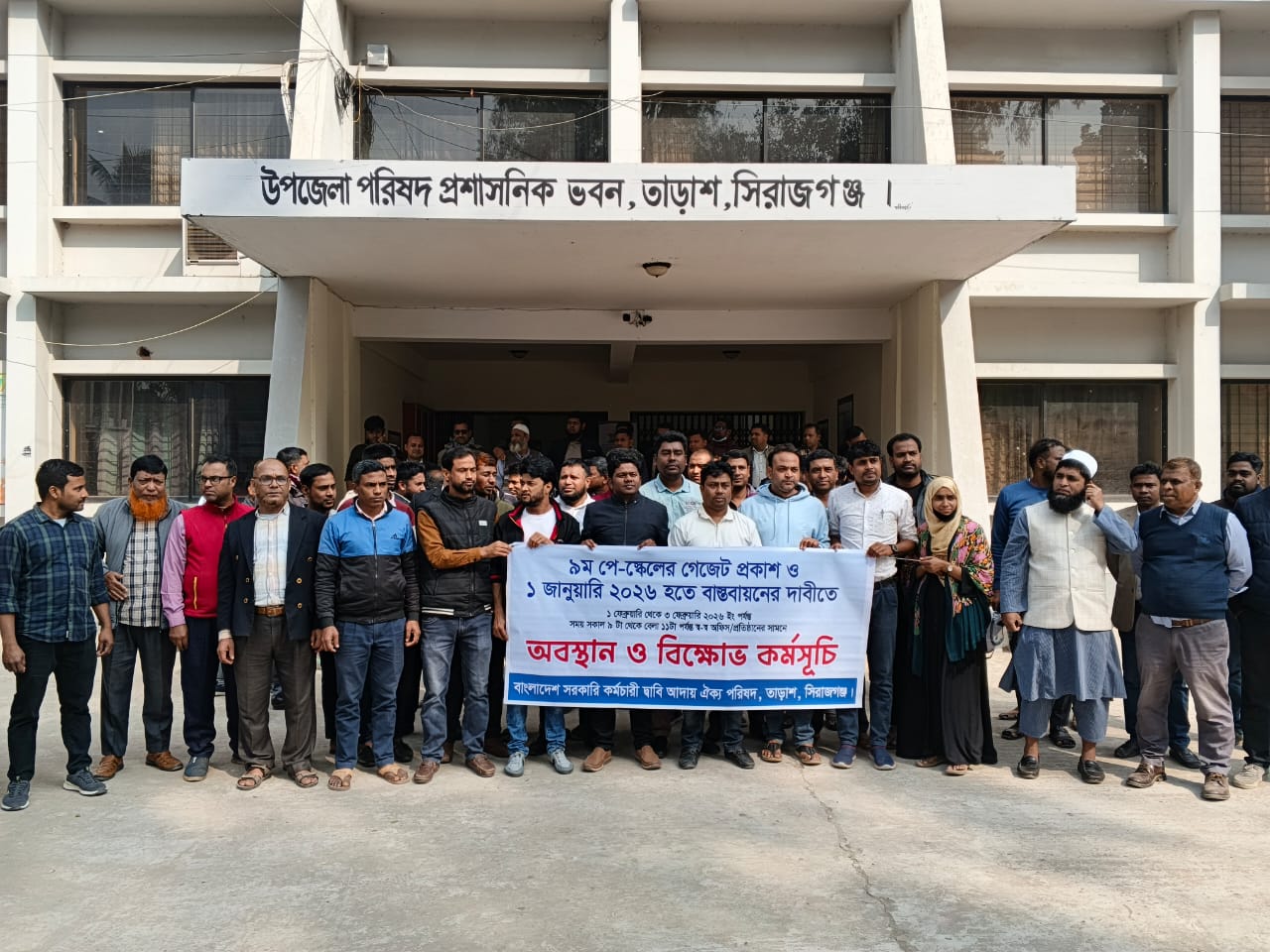 ৯ম পে-স্কেলের গেজেট দ্রুত প্রকাশ এবং ২০২৬ সালের ১ জানুয়ারি থেকে তা বাস্তবায়নের দাবিতে সিরাজগঞ্জের তাড়াশ উপজেলায় অবস্থান ও বিক্ষোভ কর্মসূচি পালন করছেন সরকারি কর্মচারীরা।