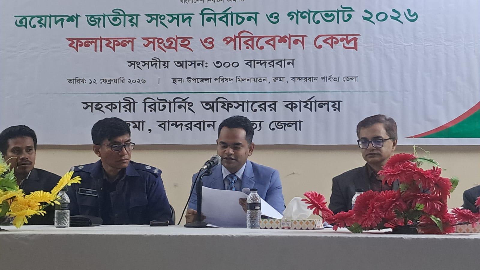 বান্দরবানের রুমা উপজেলায় ত্রয়োদশ জাতীয় সংসদ নির্বাচন ও গণভোট উপলক্ষে ১৯টি ভোটকেন্দ্রের ফলাফল ঘোষণা হয়েছে।