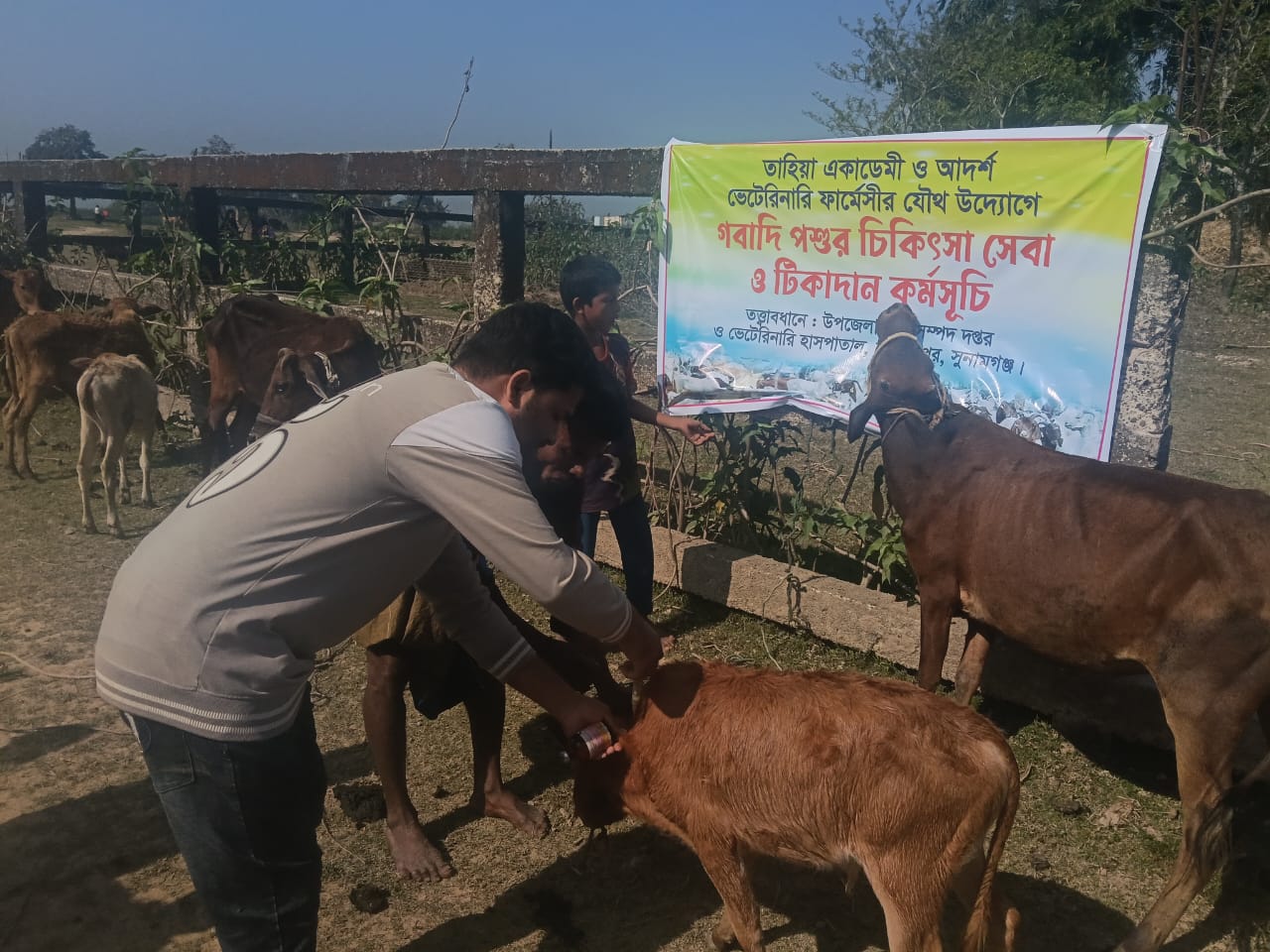 বিশ্বম্ভরপুর উপজেলার ফতেপুর ইউনিয়নের সাতগাঁও এলাকায় অনন্তপুর,বসন্তপুর ও বাগুয়া গ্রামে দিনব্যাপী "গবাদিপশুর প্রাথমিক চিকিৎসা, প্রতিকার এবং টিকাদান কর্মসূচি অনুষ্ঠিত হয়েছে।তাহিয়া একাডেমি ও আদর্শ ভেটেরিনারি ফার্মেসীর যৌথ উদ্যোগে বিশ্বম্ভরপুর উপজেলা প্রাণীসম্পদ দপ্তর ও ভেটেরিনারি হাসপাতালের তত্ত্বাবধানে মঙ্গলবার ১৭ ফেব্রুয়ারী দিনব্যাপী টিকাদান কর্মসূচি অনুষ্ঠিত হয়। প্রাথমিক চিকিৎসা সেবা ও টিকা প্রদান করেন ভিএফএ মোহাম্মদ আলমগীর হোসেন,এলএফএ নিলয় তালুকদার ও এফএ/এআই নিলয় কুমার ভদ্র।এই কর্মসূচির আওতায় স্থানীয় খামারিদের গবাদিপশুকে বিনামূল্যে প্রাথমিক চিকিৎসা, বিভিন্ন রোগ প্রতিকারের পরামর্শ এবং সরকারি মূল্যে প্রয়োজনীয় টিকা প্রদান করা হয়।অনুষ্ঠানে সভাপতিত্ব করেন,তাহিয়া একাডেমির প্রতিষ্ঠাতা-পরিচালক উদ্দ্যোক্তা ও সাংবাদিক শফিউল আলম। আদর্শ ভেটেরিনারি ফার্মেসীর সত্ত্বাধিকারী আল মামুনের সঞ্চালনায় অনুষ্ঠানে বক্তব্য রাখেন, ভিএফএ মোহাম্মদ আলমগীর হোসেন,এলএফএ নিলয় তালুকদার ও এফএ/এআই নিলয় কুমার ভদ্র প্রমূখ।
