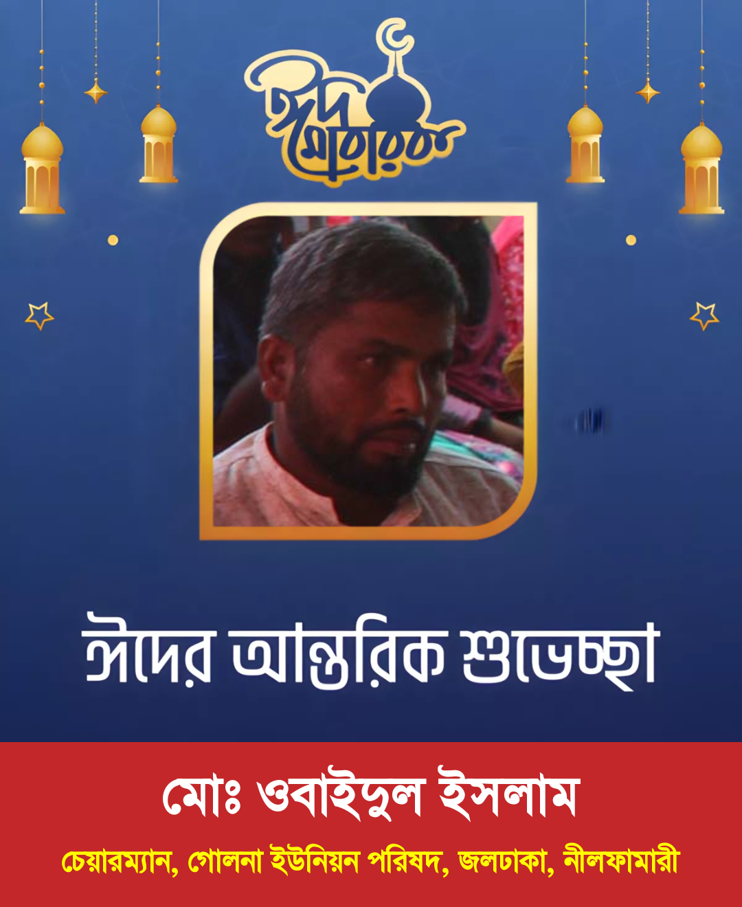 পবিত্র ঈদুল ফিতর উপলক্ষে নীলফামারী জেলার জলঢাকা উপজেলার আওতাধীন গোলনা ইউনিয়ন পরিষদের চেয়ারম্যান মোঃ ওবাইদুল ইসলাম ইউনিয়নবাসীসহ দেশ-বিদেশে অবস্থানরত সকল মুসলিমকে আন্তরিক শুভেচ্ছা ও ঈদ মোবারক জানিয়েছেন। ঈদুল ফিতরের এই আনন্দঘন মুহূর্তে সবার জীবনে সুখ, শান্তি ও সমৃদ্ধি কামনা করেন তিনি।