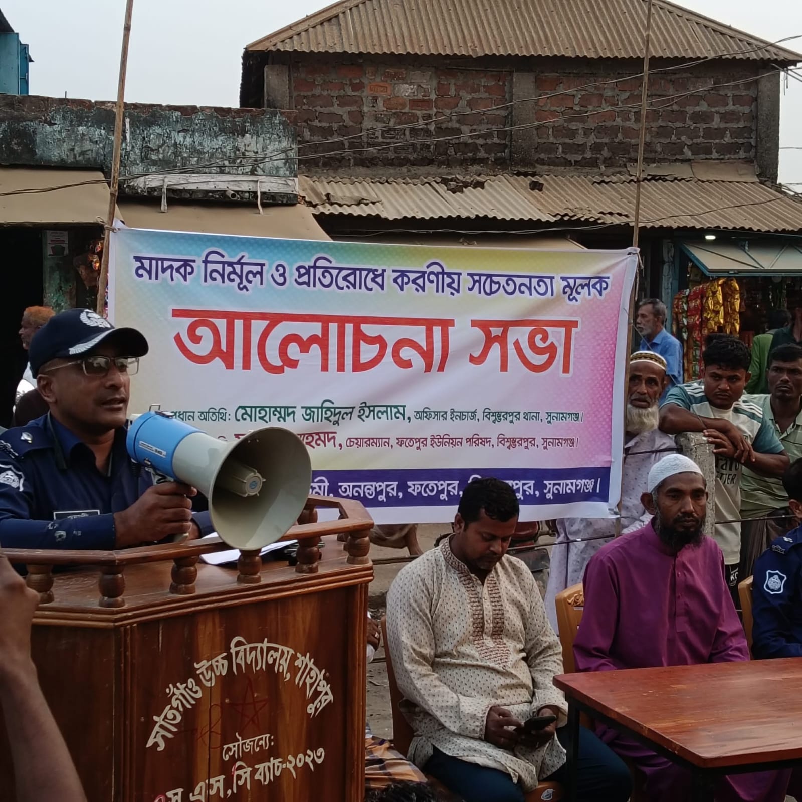 বিশ্বম্ভরপুর উপজেলার ফতেপুর ইউনিয়নের সাতগাঁও নতুন বাজারে মাদক নির্মূল ও প্রতিরোধে করণীয় সচেতনতায় আলোচনা সভা অনুষ্ঠিত হয়েছে। বুধবার বিকেলে তাহিয়া একাডেমির আয়োজনে ফতেপুর ইউনিয়ন পরিষদ চেয়ারম্যান ফারুক আহমদ'র সভাপতিত্বে ও তাহিয়া একাডেমির পরিচালক সাংবাদিক শফিউল আলম'র সঞ্চালনায় আলোচনা সভায় বক্তব্য রাখেন বিশ্বম্ভরপুর থানার ওসি তদন্ত ওয়ালী আশরাফ। তিনি মাদকের কুফল ও সব ধরনের ক্ষতিকর দিক আলোচনা করে বলেন এর পরও যারা মাদকের সাথে যুক্ত থাকবে তাদেরকে বিন্দু পরিমাণ ও ছাড় দেওয়া হবে না।এসময় আরও বক্তব্য রাখেন ইউপি সদস্য জয়নাল আবেদীন প্রবীণ পল্লিচিকিৎসক জামাল হোসেন মুস্তক আহমদ মাফিজুর রহমান মাফিজ প্রমূখ। এসময় উপস্থিত ছিলেন এস আই জামাল উদ্দিন ইউপি সদস্য নজরুল ইসলাম সাবেক ইউপি সদস্য শাহ নেছার আহমদ সহ এলাকার সর্বস্তরের মানুষ।আলোচনা সভায় ঘোষণা করা হয় যে মাদকের ব্যবসা ছেড়ে সৎ ভাবে ব্যবসা করবে তাকে তাহিয়া একাডেমির পক্ষ থেকে ৫০ হাজার টাকা পুরস্কার দেওয়া হবে। আর যদি মাদকের ব্যবসা না ছাড়ে এমন ব্যক্তি কে মাদক সহ প্রশাসনের কাছে যে ধরিয়ে দিবে ঐ সাহসী ব্যক্তিকে ও ৫০ হাজার টাকা পুরস্কার দেওয়া হবে। উল্লেখ্য ইতিমধ্যে এক ব্যক্তি মাদক ব্যবসা ছেড়ে দিয়ে সাভাবিক জীবনযাপন সহ সৎ ভাবে ব্যবসা করে যাচ্ছে।