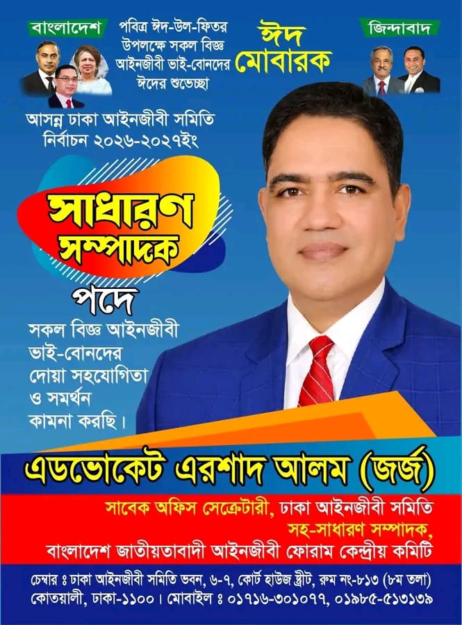 এডভোকেট এরশাদ আলম জর্জ প্রতিনিধিকে বলেন,ঈদ মোবারক!এই পবিত্র ঈদুল ফিতর আপনার ও আপনার পরিবারের জীবনের অনাবিল সুখ, শান্তি ও সমৃদ্ধি নিয়ে আসুক।
