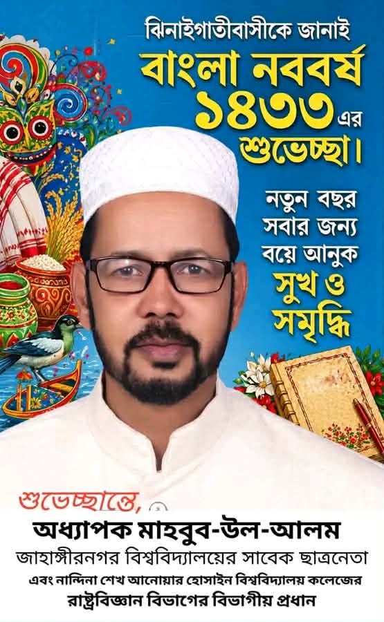 পহেলা বৈশাখ ও বাংলা নববর্ষ ১৪৩৩ উপলক্ষে শেরপুর জেলা সহ দেশবাসীকে আন্তরিক শুভেচ্ছা ও অভিনন্দন জানিয়েছেন শেরপুর জেলার ঝিনাইগাতী উপজেলার কৃতি সন্তান অধ্যাপক মাহবুব উল আলম ।