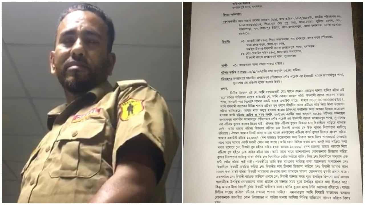 সুনামগঞ্জের জগন্নাথপুরে ইসলামী ব্যাংকের একটি এটিএম বুথ থেকে দৈনিক আলোর সকাল (অনলাইন)–এর সহ-বার্তা সম্পাদক মোঃ সাহান রহমান সোহেলের ১০ হাজার টাকা আত্মসাতের অভিযোগ উঠেছে ব্যাংকেরই নিরাপত্তাকর্মীর বিরুদ্ধে। এ ঘটনায় নিরাপত্তাকর্মী ও শাখা ম্যানেজারের বিরুদ্ধে জগন্নাথপুর থানায় লিখিত অভিযোগ দায়ের করেছেন তিনি।