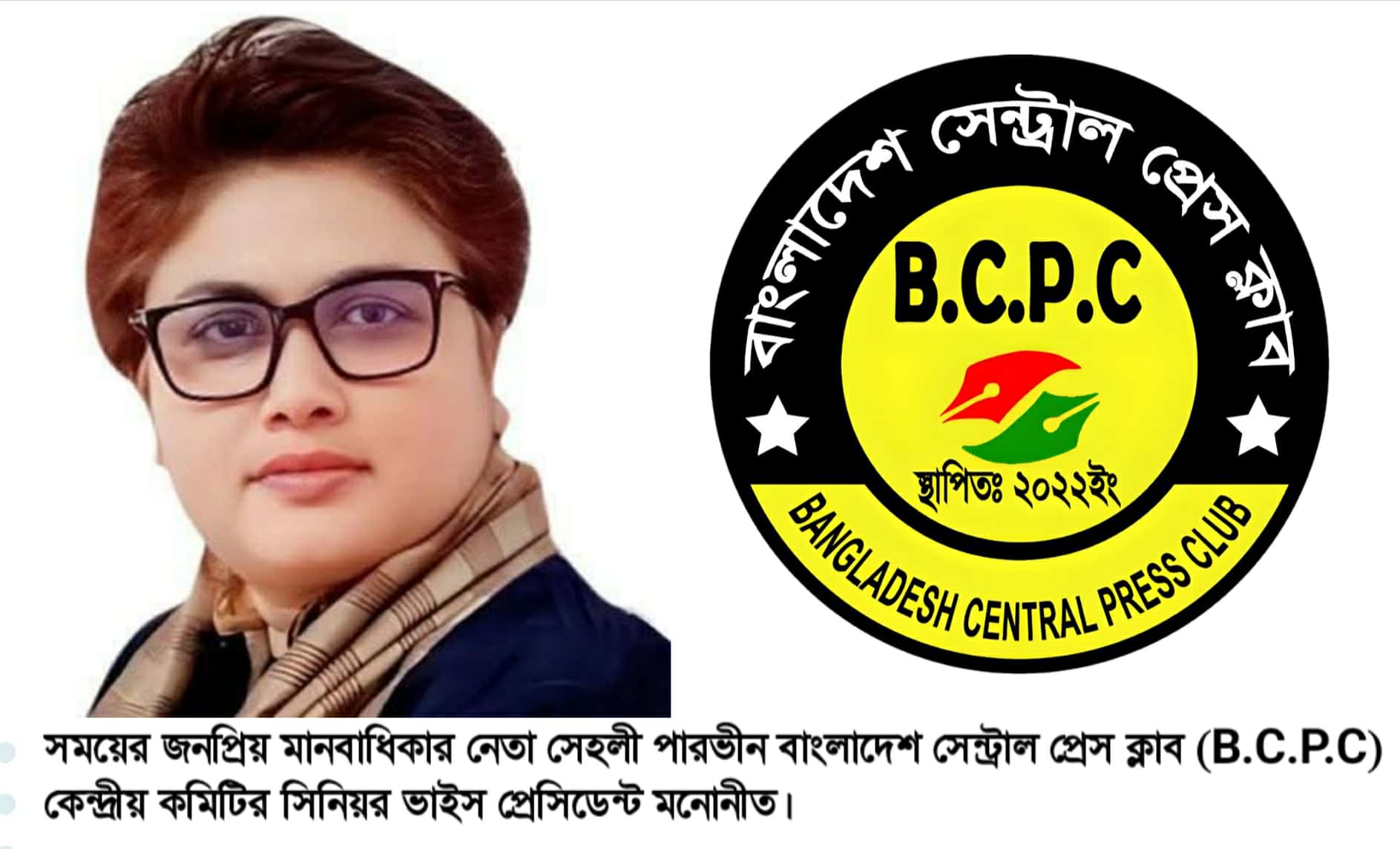 নিজস্ব প্রতিবেদক:- সময়ের জনপ্রিয় মানবাধিকার নেতা হিউম্যান এইড ইন্টারন্যাশনাল এর প্রতিষ্ঠাতা মহাসচিব সেহলী পারভীন বিসিপিসি এর কেন্দ্রীয় কমিটির সিনিয়র সহ-সভাপতি হিসেবে মনোনীত হয়েছেন। সমাজসেবা, মানবাধিকার রক্ষা, নারী ও শিশু সুরক্ষার পক্ষে দীর্ঘদিন ধরে কাজ করে আসা এ নেত্রীকে গুরুত্বপূর্ণ এই পদে মনোনীত করায় বিভিন্ন সাংবাদিক সংগঠন এবং মানবাধিকার নেতৃবৃন্দ আন্তরিক শুভেচ্ছা ও প্রাণঢালা অভিনন্দন জানিয়েছেন।