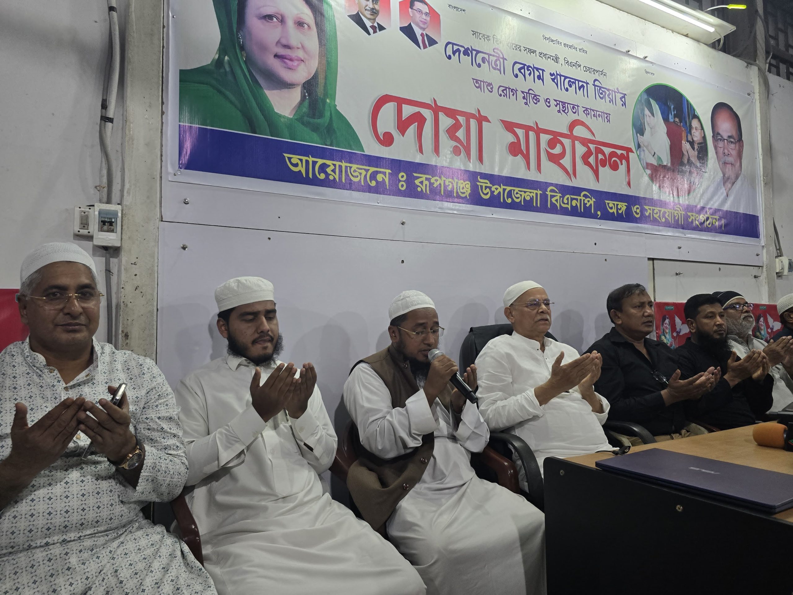 বিএনপি চেয়ারপার্সন ও সাবেক প্রধানমন্ত্রী বেগম খালেদা জিয়ার রোগমুক্তি কামনায় রূপগঞ্জে দোয়া অনুষ্ঠিত হয়েছে। গতকাল বিকালে তারাব পৌরসভার বরাব এলাকার ম্যাক্স মিলনায়তনে এই দোয়া ও আলোচনা সভা আয়োজন করেন বিএনপির কেন্দ্রীয় নির্বাহী কমিটির সদস্য ও বিএনপির মনোনয়ন প্রত্যাশী বীর মুক্তিযোদ্ধা কাজী মনিরুজ্জামান।